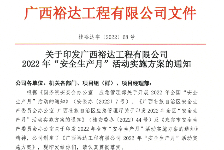 收到通知后公司积极响应贯彻落实并发布了《关于印发欧宝ob官网登录入口(中国)有限公司2022年“安全生产月”活动实施方案的通知》要求公司全体人员认真深入学习贯彻习近平总书记关于安全生产重要论述,加强活动组织部署。宣传贯彻安全生产法,强化主体责任落实。开展全员安全培训,分类强化警示教育。广泛开展宣传,营造良好安全生产氛围,以优异成绩迎接党的二十大顺利召开。