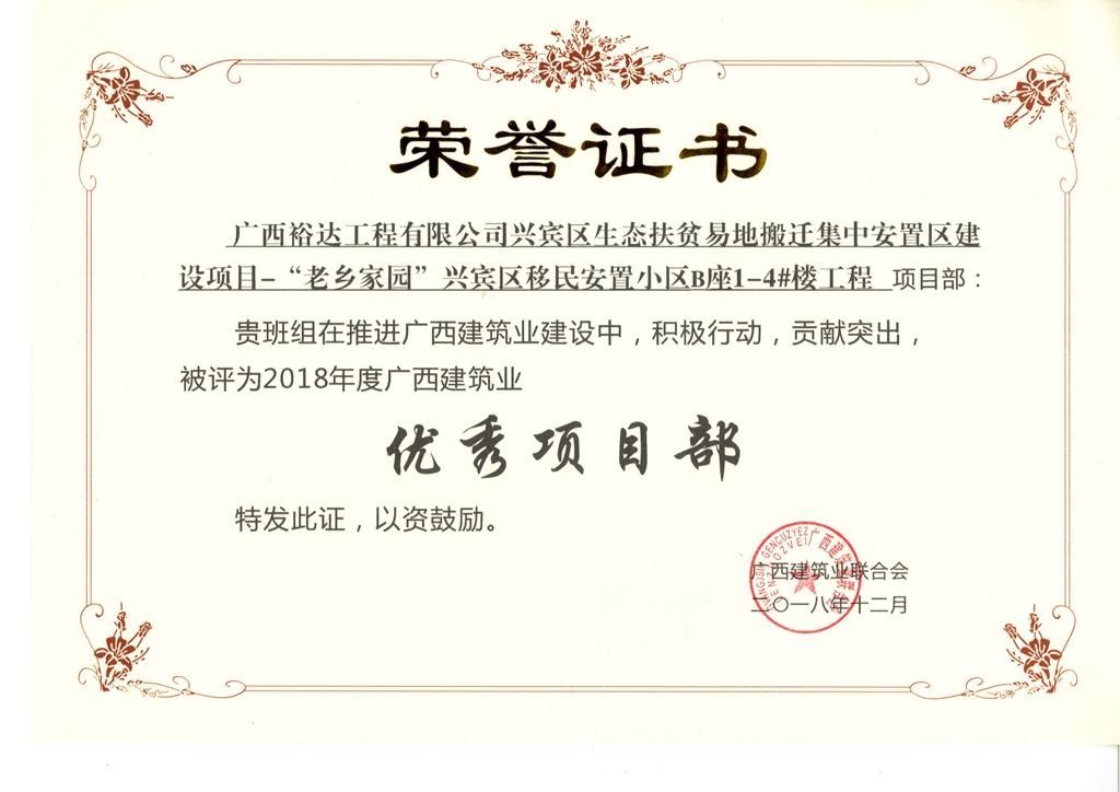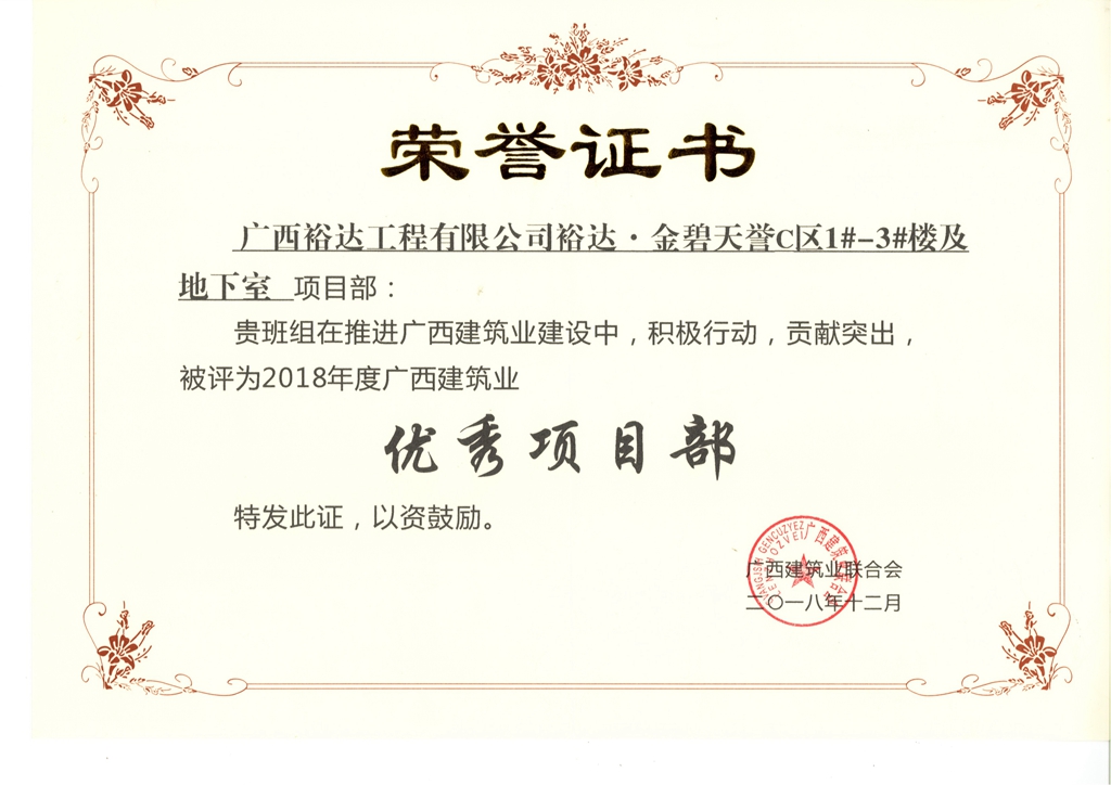 据悉,这次评选活动经过施工企业和个人自愿申报、各市建筑业联合会(协会、企业主管部门)初审和推荐,广西建筑业联合会对推荐的申报材料进行审核,并组织评委进行严格评审。此次被评为“2018年度广西建筑业优秀项目部”共166个项目,“2018年度广西建筑业优秀从业人员”共481名。此次获得的殊荣是对我司项目建设的一种肯定,将在很大程度上激励裕达人在今后的工作中提出了更高要求、向更高的目标奋进。
