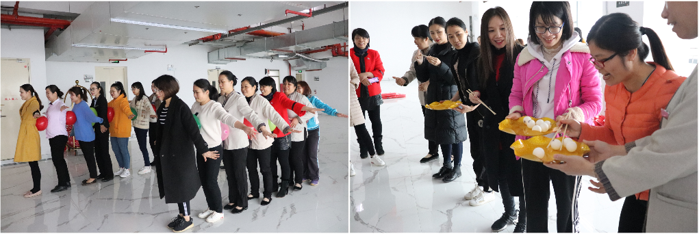 本次主题活动主要是以趣味游戏形式进行,首先是热身接力“夹气球”,女职工们齐心协力,即便是混合小组依然配合完美,以平局收场;接下来是“夹乒乓球”接力,刚做完热身运动的她们有些手抖,但不妨碍现场的比赛气氛;随后是反向思维的“踩手印脚印”游戏,接力开始之前大家都呼声“太难”,比赛时尽管惹得笑声连连,但女职工勇于实践,不断总结的精神值得赞扬;最后是激烈无比的“无敌风火轮”接力赛,即使道具中途破损,急中生智的她们仍在不违背比赛规则的情况下坚持完成了比赛,众人欢呼雀跃。