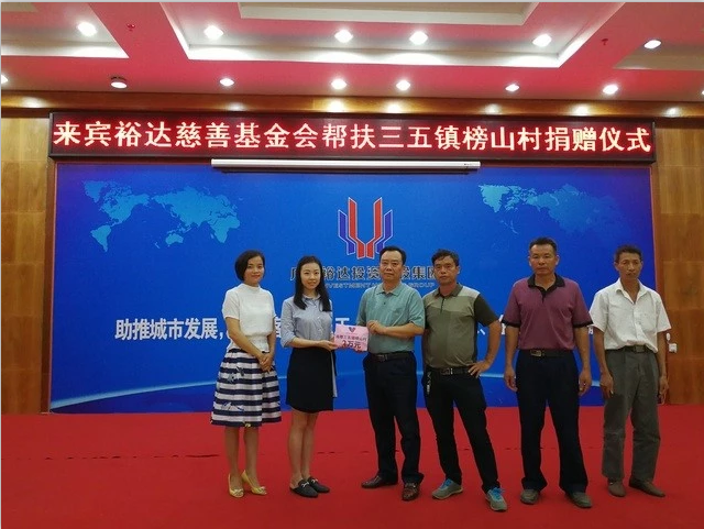 5月22日下午,来宾裕达慈善基金会向三五镇榜山村哪峡屯捐赠2万元的善款助其修建村屯道路,并在集团七楼大会议室举行了简单的捐赠仪式。来宾市民政局民间社会组织科科长覃春燕、榜山村村委及村民代表、来宾裕达慈善基金会理事黄玲艳女士、基金会秘书长陈汐女士出席了本次捐赠仪式。覃春燕科长对我慈善基金会的爱心善举表示衷心感谢,并表示将认真监督此款用于榜山村哪峡屯道路建设,致力改善村屯道路条件,为村民提供出行方便。黄玲艳理事也表示,希望来宾裕达慈善基金会的此次善举能给村民们带去温暖,为村民的生产和出行带去方便,来宾裕达慈善基金会也将会持续关注哪峡屯的后续发展,关注贫困,主动承担社会责任,帮扶贫困村早日脱贫致富。