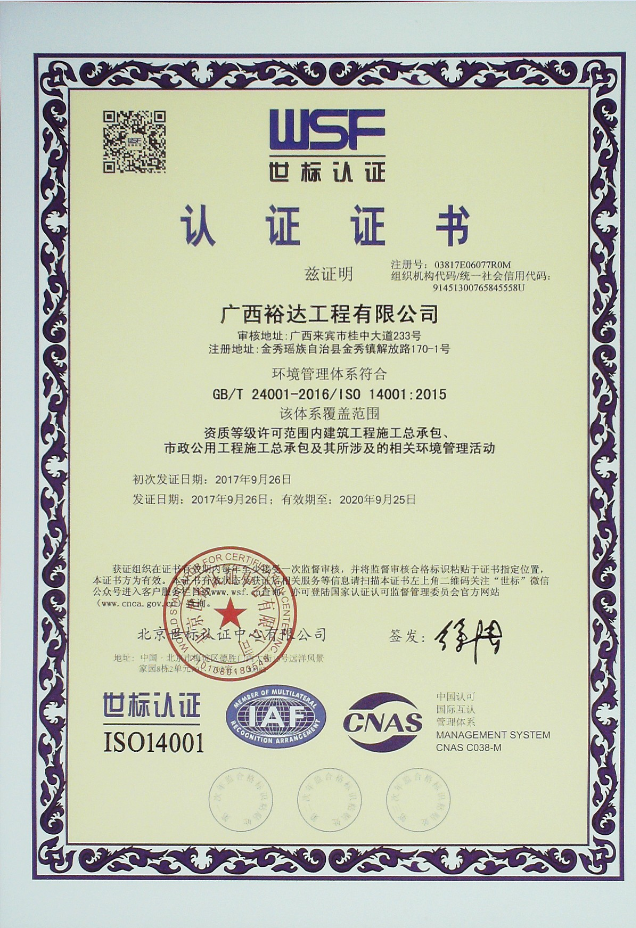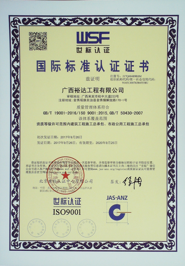 2017年9月7日至16日,经过专家组两轮现场审核,欧宝ob官网登录入口(中国)有限公司顺利通过了GB/T19001-2016《质量管理体系》、GB/T24001-2016《环境管理体系》、GB/T28001—2011《职业健康安全管理体系》、GB/T50430-2007《工程建设施工企业质量管理规范》三标一体的认证,并于2017年9月26日获得由北京世标认证中心有限公司颁发的ISO9001:2015、GB/T50430-2007、ISO14001:2015和GB/T 28001-2011的认证证书。