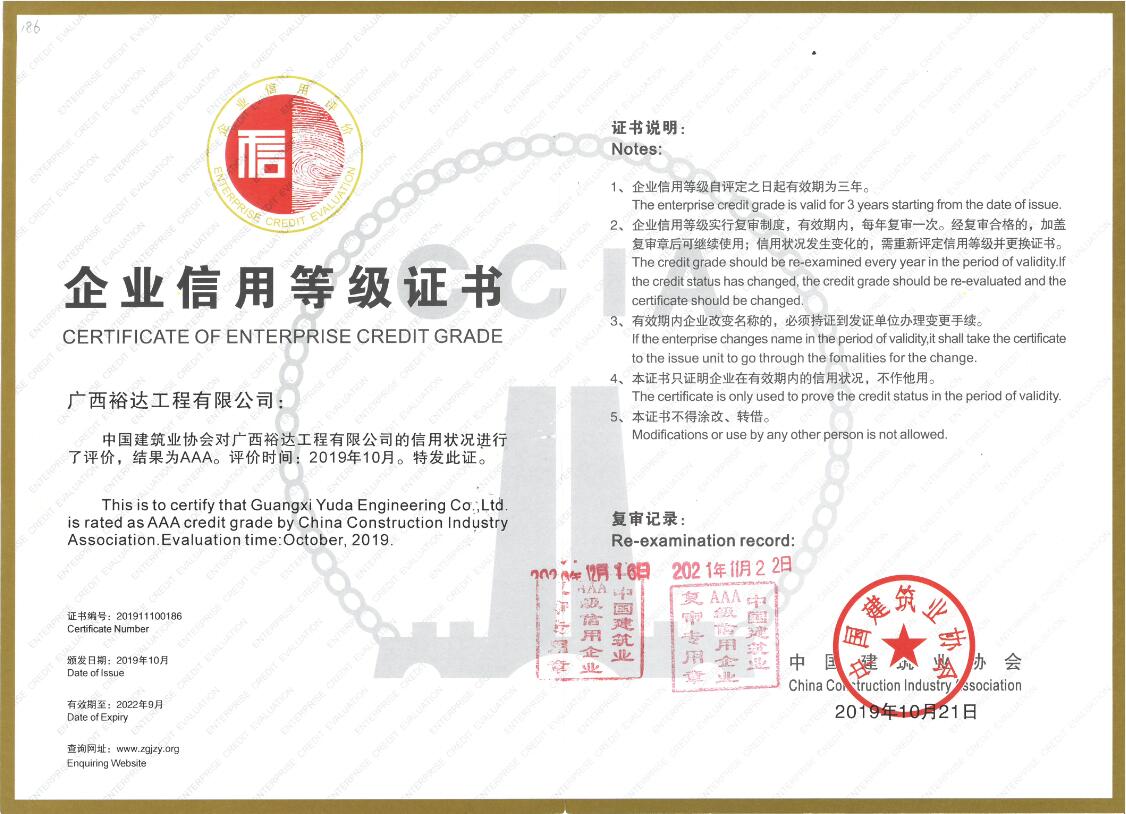 建筑企业信用等级证书,由中国建筑业协会通过各项指标对企业进行综合评估出示的信用等级报告,企业信用等级分为AAA(信用很好)、AA、A、B、C三等五级,实行动态管理,获证后前2年每年进行复审,每3年进行一次复评。既是企业的一种荣誉,也在许多商业活动中能够广泛应用。
