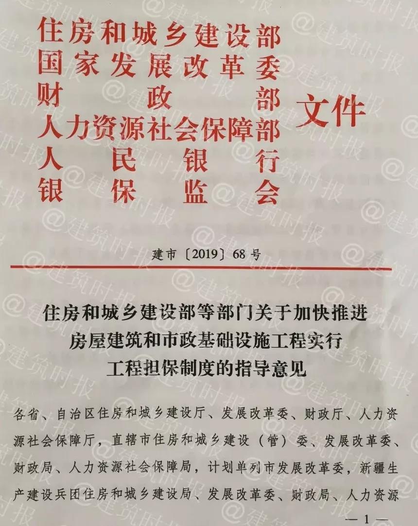 日前,住建部联合发改委、财政部、人社部、人民银行、银保监会共同发文(建市【201968号)加快推进房屋建筑和市政基础设施工程实行工程担保制度。
