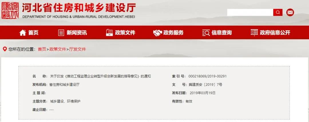 2019年河北省住建厅发布关于印发《推动工程监理企业转型升级创新发展的指导意见》的通知。明确: