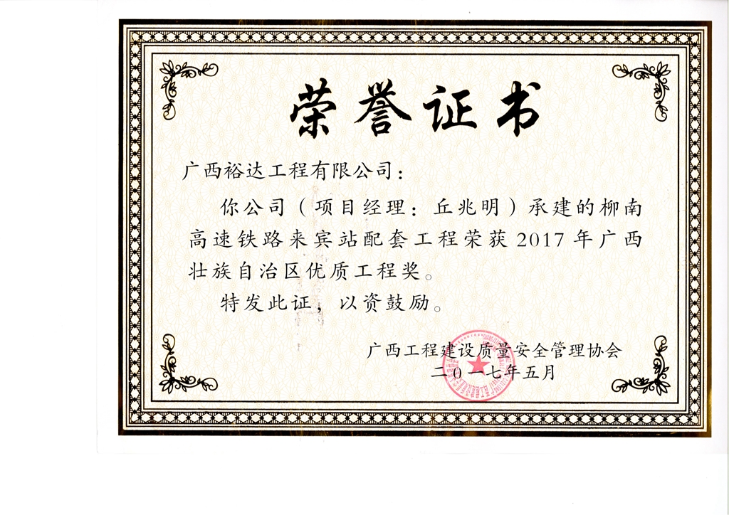 2017年广西壮族自治区优质工程(柳南高速铁路来宾站配套工程)