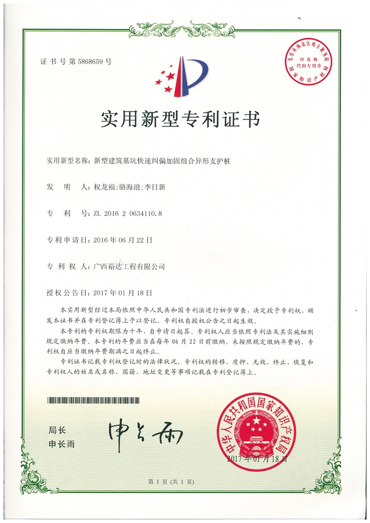 2017年实用新型专利证书(新型建筑基坑快速纠偏加固组合异形支护桩)