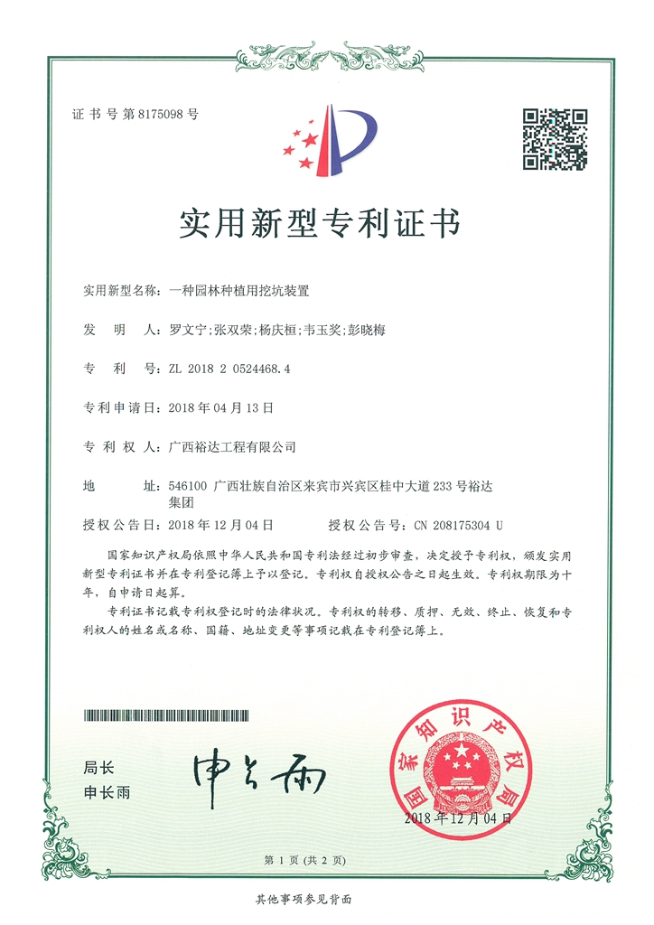 2018年实用新型专利证书(一种园林种植用挖坑装置)