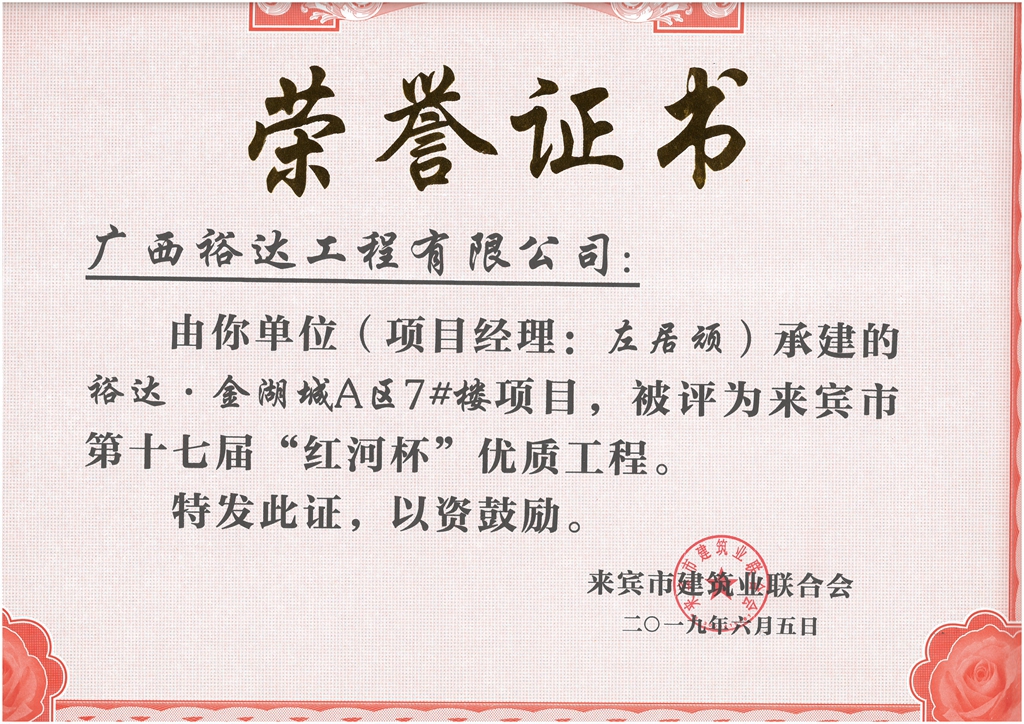 裕达·金湖城A区7#楼项目评为来宾市第十七届”红河杯“优质工程(项目经理:左居顽)
