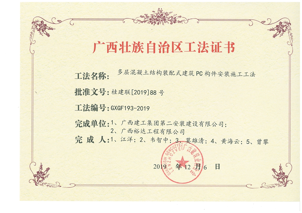 多层混凝土结构装配式建筑PC构件安装施工工法(广西建工二安)